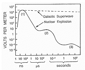 Figure 3. Intensity vs. time plot for EMP from a high-altitude nuclear explosion (solid line) compared to that from a hypothetical superwave (dashed line). The numbers designate early-time, intermediate-time, and late-time EMP phases (ns = nanoseconds, µs = microseconds).