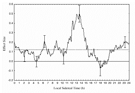 ESP Effectiveness (mean effect size) Versus Local Sidereal Time for a 20 Year Data Set (from J. Spottiswoode, Journal Scientific Exploration, figure 3).