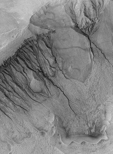 Οι Αριανές καταιγίδες μπορεί να είναι πρόσφατες. Νερό έχει ξεπηδήσει από ρωγμές στον Αρη σχετικά πρόσφατα, λέει μία ομάδα ερευνητών από το Πανεπιστήμιο της Αριζόνα και τη NASA. Οι επιστήμονες είναι από καιρό γνώστες προφανών εκροών καναλιών στον Αρη, απόδειξη αρχαίων πλημμυρών γύρω στα 2 εκατομμύρια χρόνια πριν. Αλλά οι νέες φωτογραφίες που πάρθηκαν από την κάμερα του Mars Orbiter πάνω στον Mars Global Surveyor (MGS) δείχνουν επιφάνειες πάνω από έδαφος σε σχήμα σταγόνας, γεωλογική απόδειξη καταστροφικών πλημμυρών πριν από 10 εκατομμύρια χρόνια, ισχυρίζεται η ομάδα του Πανεπιστημίου της Αριζόνα/NASA. NASA website, 2002-02-22 Οι αποδείξεις που παρουσιάζονται στο Γη Πυρόβλητος , υποδεικνύουν ότι αυτά και άλλα Αρειανά πλημμυρικά κανάλια μπορεί να είναι ακόμα νεώτερα, να χρονολογούνται κατά το τέλος του τελευταίου παγετώνα. |